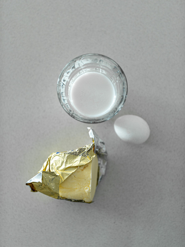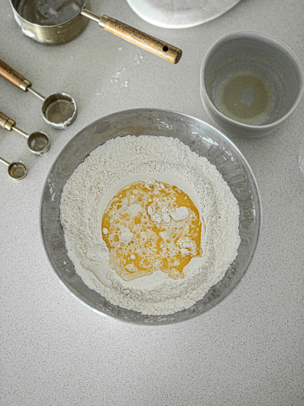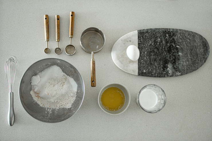 | 1 cup APF 1 tsp baking powder 1/2 tsp baking soda 1/2 tsp salt 2 tbsp white sugar | 1 large egg |